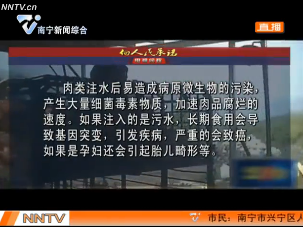 南寧市食品藥品監(jiān)督管理局局長(zhǎng)黃明瑞回應(yīng):對(duì)于注水肉的問(wèn)題,我們從改革以來(lái)就一直堅(jiān)持打擊,特別是今年夏季針對(duì)肉類食品進(jìn)行了大規(guī)模的整治行動(dòng),發(fā)現(xiàn)問(wèn)題后馬上進(jìn)行懲處。首先我們要從源頭上杜絕注水肉,第二,肉類在進(jìn)入市場(chǎng)要進(jìn)行檢驗(yàn)檢測(cè),合格以后才能上市銷售,市場(chǎng)開放方要建立查驗(yàn)查證制度,作為監(jiān)管部門要加大巡查力度,發(fā)現(xiàn)有違法添加的要立案進(jìn)行查處。
